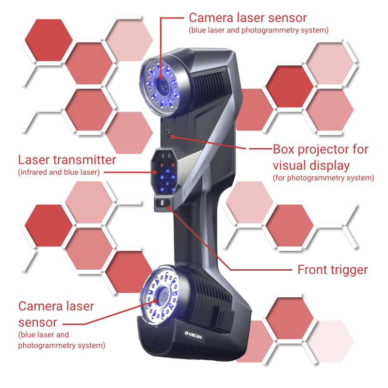 The inclusion of infrared laser and the built-in photogrammetry system makes the KSCAN-E standout from all other 3D scanners in its class. The infrared laser brings to the table the ability to scan large objects the size of a turbine, while the photogrammetry system helps maintain a high volumetric accuracy when scanning those large objects.